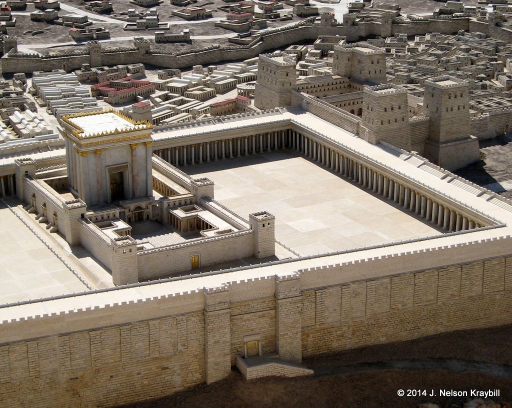 Filling most of this photograph is the spacious “Court of the Gentiles,” which any Jew or Gentile could enter. Along left and right sides of walls around the inner temple courts, however, a fence marks the point beyond which no Gentile could pass. Only Jews could enter the near court (Women’s Court) of the temple complex. Only Jewish men could enter the far court (Court of Priests), and priests alone could enter the Holy Place of the main Temple building. Once a year the High Priest could enter the Holy of Holies.