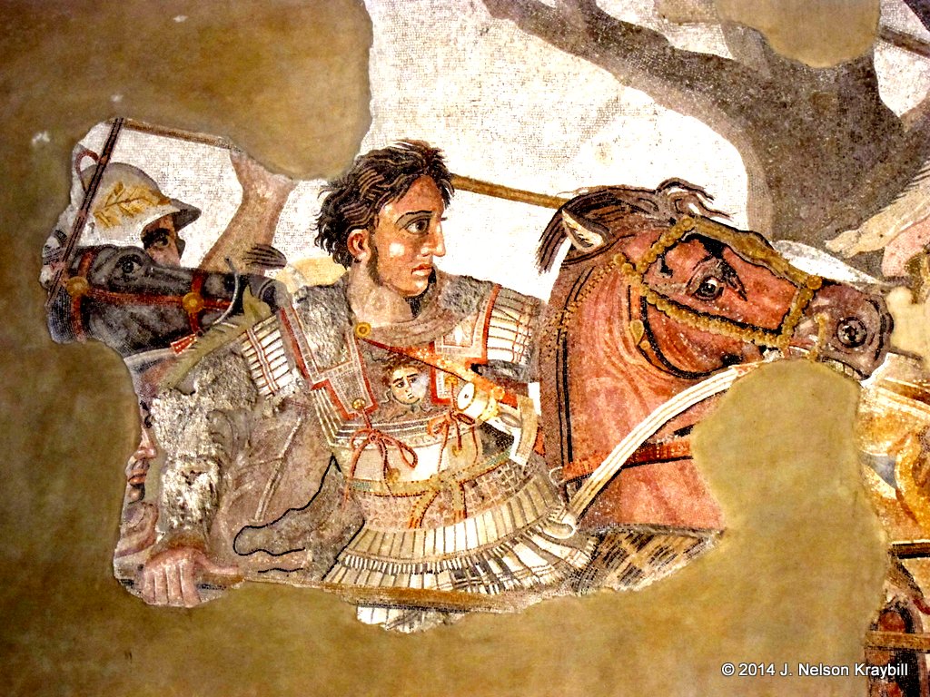 A mosaic from Pompeii (ca. 100 BC) shows Alexander the Great also charging into battle—in this case against the Persians. But Alexander has a literal sword in hand, and he intends to kill. Roman emperors in the first century routinely put similar images of themselves on coins.