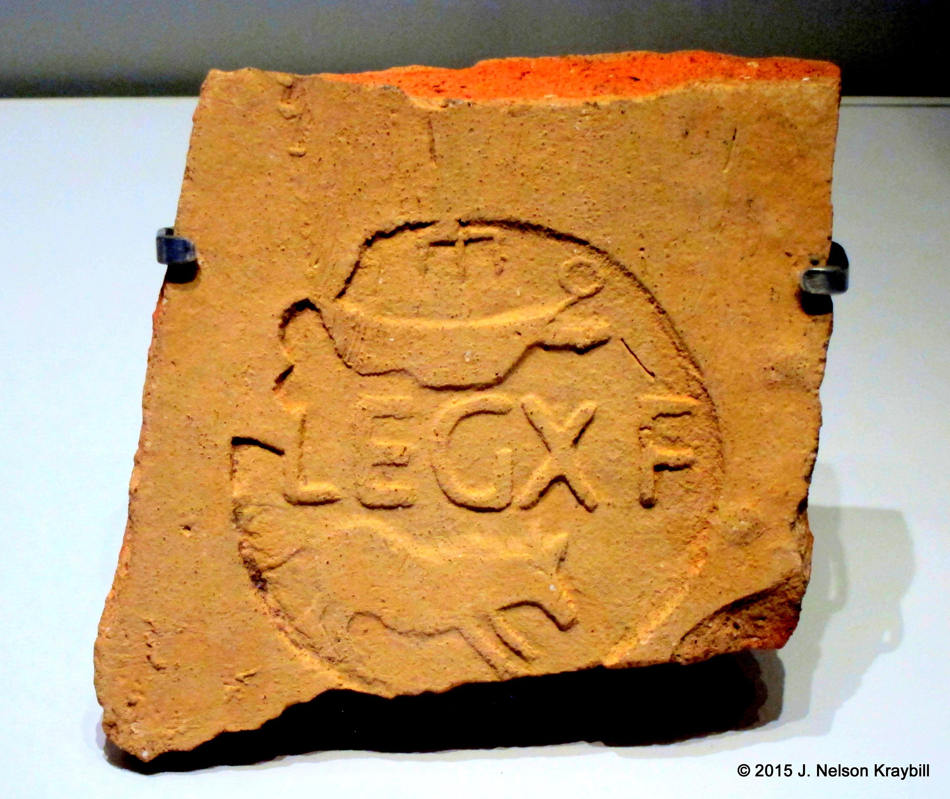 A brick stamp from the Roman era reads LEG X F, meaning LEG[ion] X [“ten”] F[retensis], official name of Roman troops that subdued Palestine. At the bottom of the stamp is the pig that symbolized this army.
