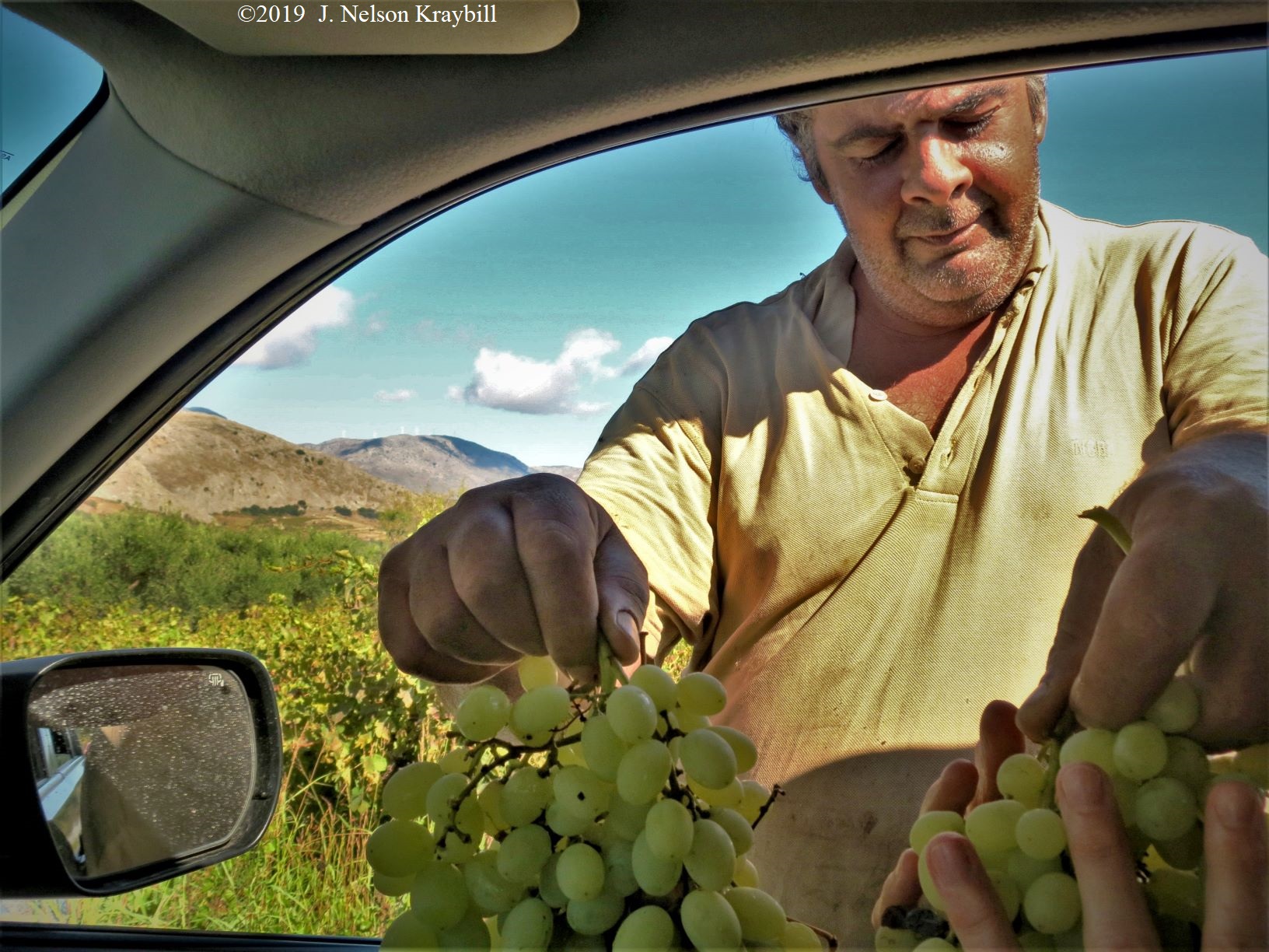 A grape farmer in Crete offers two clusters from his vineyard as a gift.