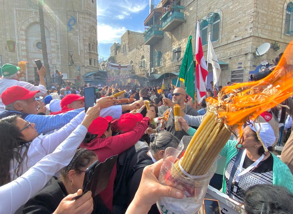 The Orthodox Patriarch had emerged from the sepulcher in Jerusalem with two lit candles to share with the world. It took about ninety minutes for the fire to reach Bethlehem, by which time marching bands were playing and thousands had convened with candles—no, BUNDLES of candles. The flame arrived and rapidly spread across the crowd with commotion, joy, and lots of photographs. At that moment charter planes were carrying the fire to countries around the world.