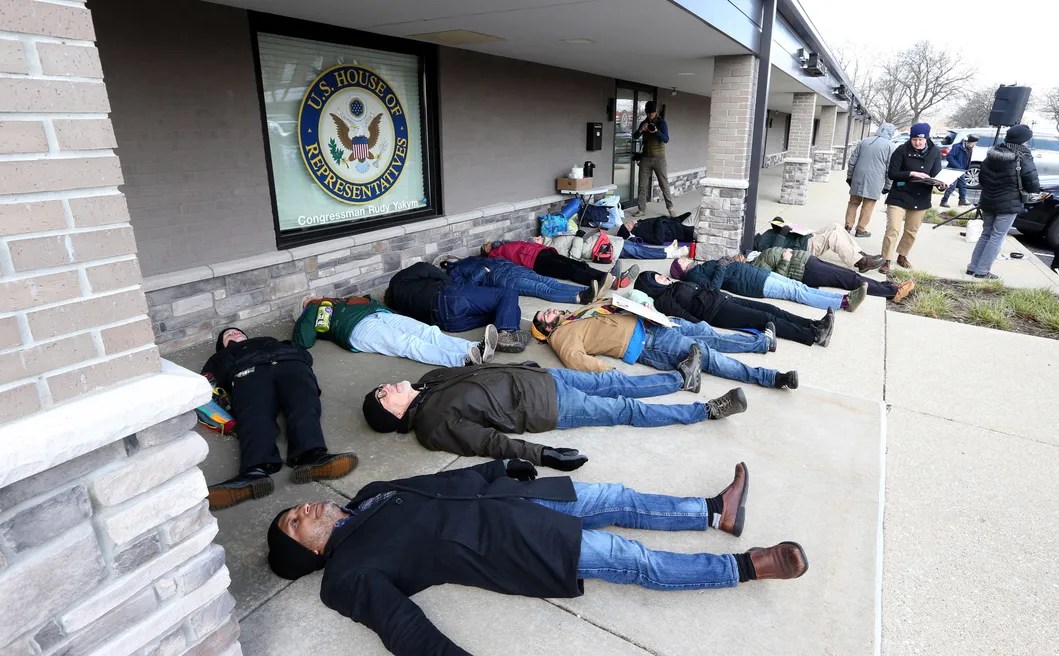 On Wednesday of Holy Week I lay “dead” with others on a cold sidewalk for forty-five minutes outside the office of our Congressman Rudy Yakym in Mishawaka, Indiana. (I am the second person from the camera, in the olive jacket.) The Congressman sends out mailings saying, “Israel needs our unwavering support now more than ever as they defend themselves and bring Hamas terrorists to justice.”