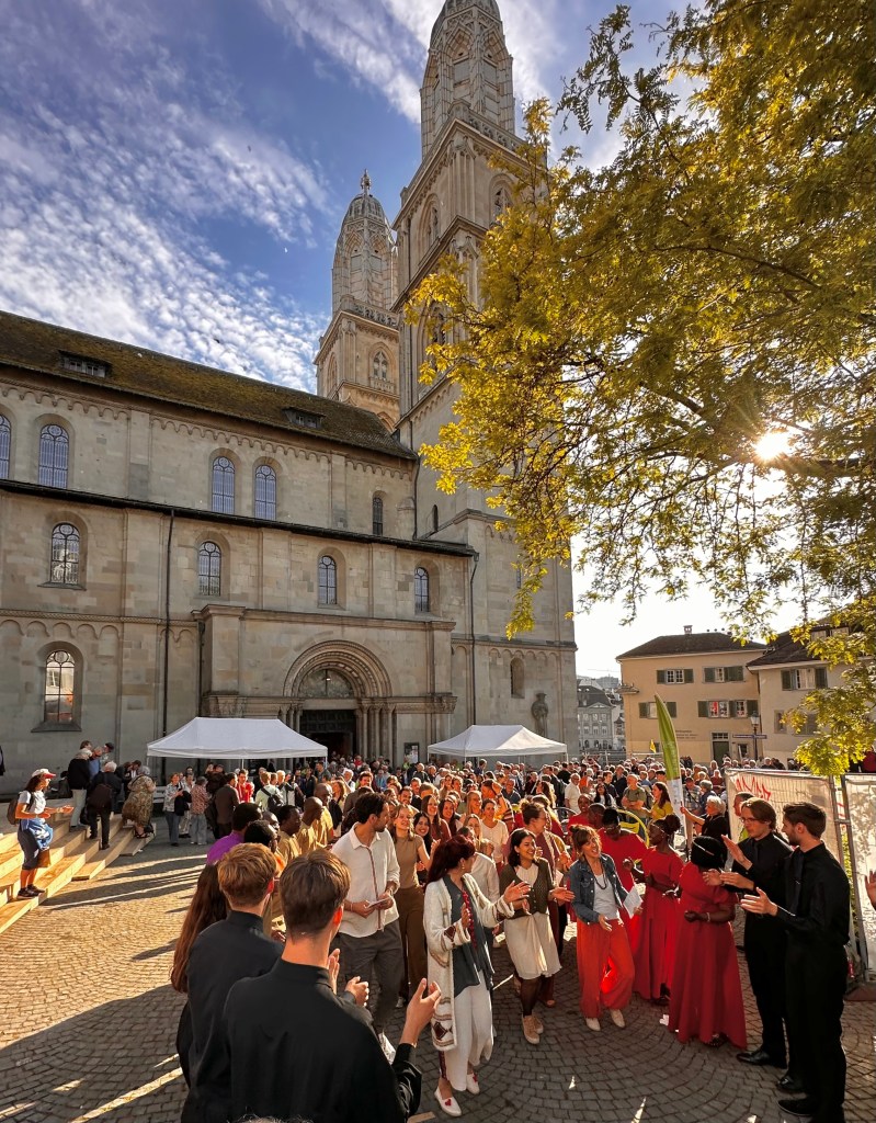 I had a small part in the service (giving context to the foot washing), and had a seat I didn’t deserve—front row just off center aisle. When the service ended, a parade of choirs—mostly young adults—recessed down the center aisle and out into an adjacent plaza. They and all the congregation sang, “Siyahamba . . . We are marching in the light of God . . . !” Scores of choir members formed a double line through which all attendees then marched. Being among the first out of the Grossmünster, I took the attached photograph.